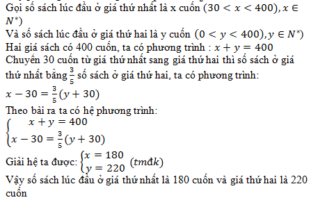 Hai giá sách có 400 cuốn. Nếu chuyển 30 cuốn từ giá thứ nhất sang giá thứ hai thì số sách ở giá thứ nhất bằng 3/5 cuốn sách ở giá thứ hai. Tính sổ sách lúc đầu ở mỗi giá.
