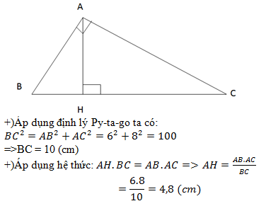 Cho tam giác ABC vuông tại A, đường cao AH (H∈ BC). Biết AB = 6cm, AC = 8cm. Tính BC, AH.