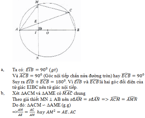 Cho đường tròn (O), đường kính AB cố định, điểm I nằm giữa A và O. Kẻ dây cung MN vuông góc với AB tại I. Gọi C là một điểm tùy ý thuộc cung lớn MN (C không trùng với M, N và B). Nối AC cắt MN tại E.