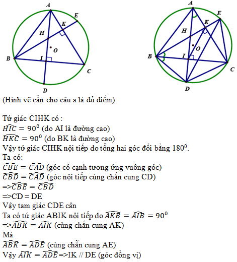 Tứ giác CIHK là tứ giác nội tiếp. Tam giác CDE cân. IK song song với DE.Quảng cáo