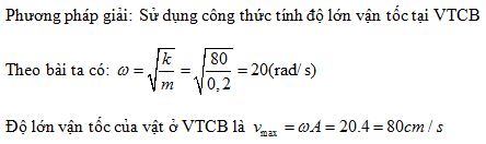 Con lắc lò xo gồm vật nhỏ có khối lượng 200 g và lò xo nhẹ có độ cứng 80 N/m. Con lắc dao động điều hòa theo phương ngang với biên độ 4 cm. Độ lớn vận tốc của vật ở vị trí cân bằng là