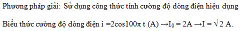 Cường độ dòng điện chạy qua một đoạn mạch có biểu thức i =2cos100π t (A).Cường độ hiệu dụng của dòng điện này là