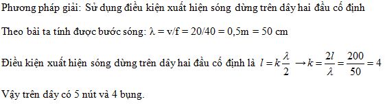 Một sợi dây AB dài 100 cm căng ngang, đầu B cố định, đầu A gắn với một nhánh của âm thoa dao động điều hòa với tần số 40 Hz. Trên dây AB có một sóng dừng ổn định, A được coi là nút sóng. Tốc độ truyền sóng trên dây là 20 m/s. Kể cả A và B, trên dây có