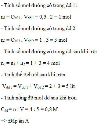 Trộn 2 lit dd đường 0,5M với 3 lit dd đường 1M. Tính nồng độ mol của dd sau khi trộn