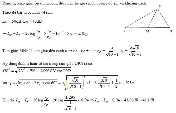 Cho 4 điểm O, M, N và P đồng phẳng, nằm trong một môi trường truyền âm. Trong đó, M và N nằm trên nửa đường thẳng xuất phát từ O, tam giác MNP là tam giác đều. Tại O, đặt một nguồn âm điểm có công suất không đổi, phát âm đẳng hướng ra môi trường. Coi môi trường không hấp thụ âm. Biết mức cường độ âm tại M và N lần lượt là 50dB và 40dB. Mức cường độ âm tại P là