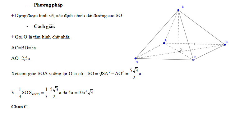Hình chóp tứ giác S.ABCD có đáy là hình chữ nhật cạnh AB=4a, AD=3a; các cạnh bên đều có độ dài bằng 5a. Thể tích hình chóp S.ABCD bằng: