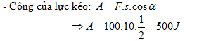 Một người kéo một thùng gỗ trượt trên sàn nhà bằng một sợi dây hợp với phương nằm ngang một góc 600, lực tác dụng lên dây là 100 N, thùng gỗ di chuyển được một đoạn 10 m. Tính công của lực kéo?