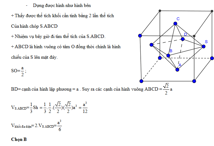 Người ta gọt một khối lập phương gỗ để lấy khối tám mặt đều nội tiếp nó ( tức là khối có các đỉnh là các tâm của các mặt khối lập phương). Biết các cạnh của khối lập phương bằng a. Hãy tính thể tích của khối tám mặt đều đó: