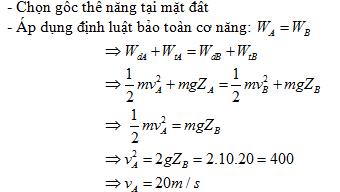 Một vật được ném thẳng đứng lên cao với vận tốc đầu 20 m/s. Chọn gốc thế năng tại vị trí ném, lấy g= 10 . Áp dụng định luật bảo toàn cơ năng, tìm độ cao cực đại mà vật đạt được?