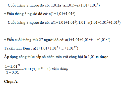 Một người gửi tiết kiệm ngân hàng, mỗi tháng gửi 1 triệu đồng, với lãi suất kép 1% trên tháng. Gửi được hai năm 3 tháng người đó có công việc nên đã rút toàn bộ gốc và lãi về. Số tiền người đó được rút là