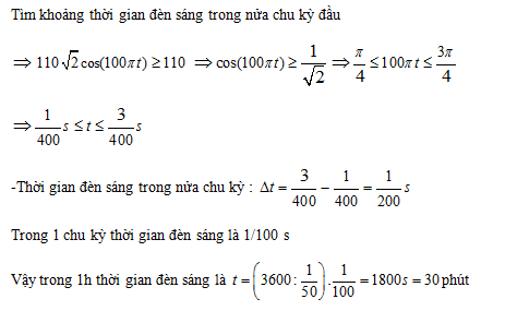 . Biết đèn chỉ sáng khi hiệu điện thế ở hai đầu đèn có độ lớn tối thiểu là 110V . Thời gian đèn sáng trong 1h là