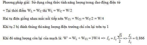 Một mạch dao động LC lí tưởng gồm cuộn thuần cảm L và hai tụ C giống nhau mắc nối tiếp. Mạch đang hoạt động, ngay tại thời điểm năng lượng điện trường và năng lượng từ trường trong mạch bằng nhau, một tụ bị đánh thủng hoàn toàn. Dòng điện cực đại trong mạch sau đó bằng bao nhiêu lần so với lúc đầu:
