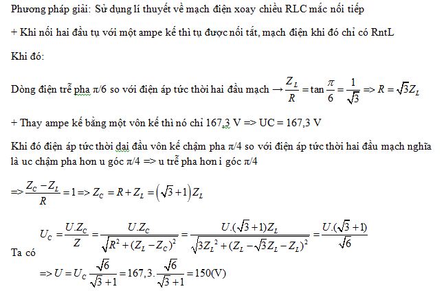 Đặt một nguồn điện xoay chiều có hiệu điện thế hiệu dụng U và tần số f vào hai đầu của đoạn mạch gồm R, L, C mắc nối tiếp, cuộn dây thuần cảm. Nối hai đầu tụ với một ampe kế thì thấy nó chỉ 1A đồng thời dòng điện chạy qua ampe kế chậm pha π/6 so với hiệu điện thế tức thời giữa hai đầu đoạn mạch. Nếu thay ampe kế bằng một vôn kế thì thấy nó chỉ 167,3 V, đồng thời hiệu điện thế tức thời giữa hai đầu vôn kế chAAJm pha một góc π/4 so với hiệu điện thế tức thời giữa hai đầu đoạn mạch. Hiệu điện thế dụng của nguồn xoay chiều là: