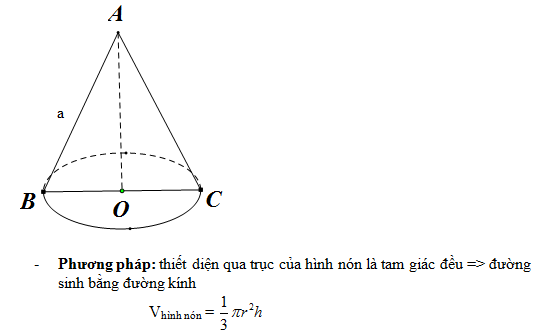Thiết diện qua trục của hình nón tròn xoay là một tam giác đều có cạnh bằng a . Thể tích