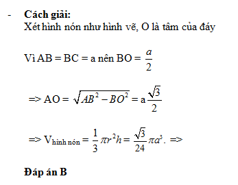 Thiết diện qua trục của hình nón tròn xoay là một tam giác đều có cạnh bằng a . Thể tích của khối nón bằng: