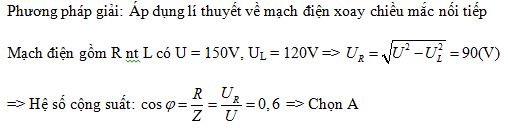 Đặt điện áp xoay chiều có giá trị hiệu dụng 150V vào hai đầu đoạn mạch gồm điện trở thuần nối tiếp với cuộn cảm thuần. Điện áp hiệu dụng giữa hai đầu cuộn cảm là 120V. Hệ số công suất của đoạn mạch là