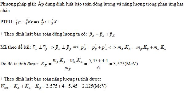 đang đứng yên. Phản ứng tạo ra hạt nhân X và hạt α. Hạt α bay ra theo phương vuông góc với phương tới của proton và có động năng 4MeV. Khi tính động năng của các hạt, lấy khối lượng các hạt tính theo đơn vị khối lượng nguyên tử bằng số khối của chúng. Năng lượng tỏa ra trong phản ứng này bằng