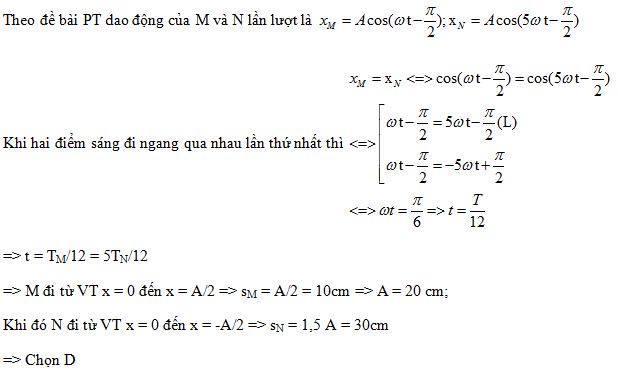 Hai điểm sáng M và N dao động điều hòa cùng biên độ trên trục Ox, tại thời điểm bản đầu hai chất điểm cùng đi qua VTCB theo chiều dương. Chu kì dao động của M gấp 5 lần chu kì dao động của N. Khi hai chất điểm đi ngang qua nhau lần thứ nhất thì M đã đi được 10cm. Quãng đường đi được trong khoảng thời gian đó của N bằng
