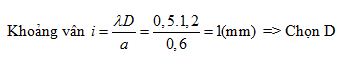 Trong thí nghiêm Iang về giao thoa ánh sáng, các khe S1 và S2 được chiếu bởi ánh sáng đơn sắc có bước sóng λ = 0,5 µm phát ra từ khe sáng S song song và cách đều hai khe S1 và S2. Khoảng cách giữa hai khe S1 và S2 là a = 0,6mm, khoảng cách từ mặt phẳng chứa hai khe đến màn là D = 1,2m. Khoảng vân giao thoa là