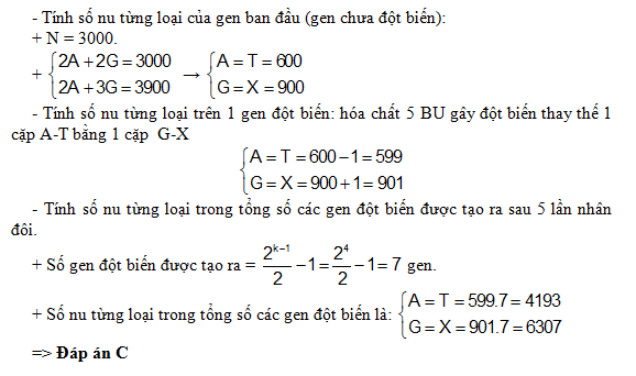 Một gen có chiều dài 0,51µm và có 3900 liên kết hiđrô tiến hành nhân đôi 5 đợt. Nếu trong lần nhân đôi đầu tiên của gen đã có 1 phân tử 5-Brôm Uraxin liên kết với một nuclêôtit trên một mạch khuôn của gen thì tổng số nucleotit mỗi loại có trong các gen đột biến là bao nhiêu? Biết rằng 5-Brôm Uraxin chỉ có một lần thay đổi cấu trúc trong suốt quá trình nhân đôi của gen trên.