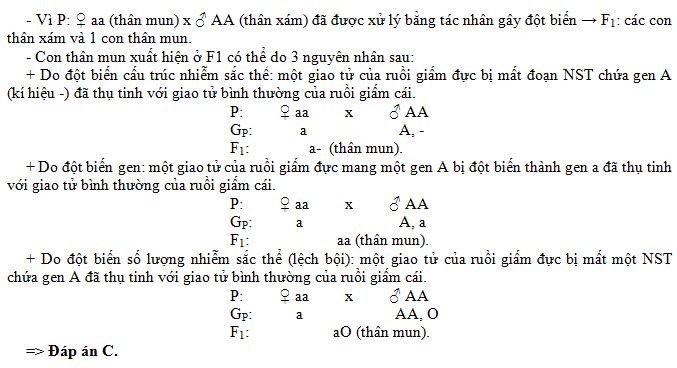 Khi lai giữa ruồi giấm cái thân mun đồng hợp (aa) với ruồi giấm đực thân xám đồng hợp (AA) vốn đã được xử lý bằng tác nhân gây đột biến. Đời con chỉ xuất hiện một con ruồi giấm đực thân mun độc nhất, còn tất cả các con ruồi giấm còn lại đều có kiểu hình thân xám. Các lập luận được đưa ra để lý giải cho trường hợp trên bao gồm: