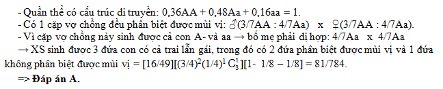 Cho biết ở người gen A quy định tính trạng phân biệt được mùi vị. Alen a quy định không
