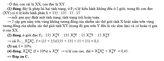 Biết rằng hai tính trạng trên được qui định bởi 2 cặp gen A, a và B, b, hoán vị gen chỉ xảy ra ở giới cái. Phát biểu sau đây là đúng?