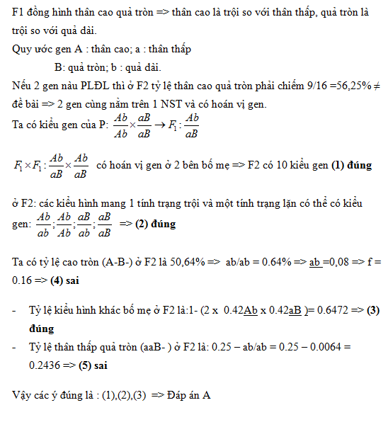 Ở một loài thực vật, tính trạng chiều cao là do một cặp gen quy định, tính trạng hình dạng quả do một cặp gen khác quy định. Cho cây thân cao, quả dài thuần chủng giao phấn với cây thân thấp, quả tròn thuần chủng (P) thu được F1 100% thân cao quả tròn. Cho các cây F1 tự thụ phấn, thu được F2 gồm 4 loại kiểu hình, trong đó cây thân cao quả tròn chiếm tỷ lệ 50,64%. Biết rằng trong quá trình phát sinh giao tử đực và cái đều xảy ra hoán vị gen với tần số như nhau. Trong các kết luận sau, kết luận nào đúng với phép lai trên ?
