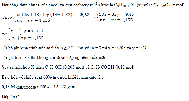 Hỗn hợp X gồm một ancol và một axit cacboxylic đều no, đơn chức và mạch hở có cùng số nguyên tử cacbon trong phân tử. Đốt cháy hoàn toàn 25,62 gam X thu được 25,872 khí CO2 (ở đktc). Đun nóng 25,62 gam X với xúc tác H2SO4 đặc thu được m gam este (giả sử hiệu suất phản ứng este hóa bằng 60%). Giá trị của m gần nhất với :