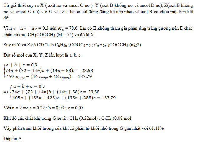 X, Y, Z là 3este đều đơn chức, mạch hở không cho phản ứng tráng gương (trong đó X no, Y và Z có 1 liên kết đôi C=C trong phân tử). Đốt cháy 23,58 gam hỗn hợp E chứa X, Y, Z với O2 vừa đủ, sản phẩm cháy dẫn qua dung dịch Ba(OH)2 dư thấy khối lượng dung dịch giảm 137,79 gam so với trước phản ứng. Mặt khác, đun nóng 23,58 gam E với 200 ml dung dịch NaOH 1,5M (vừa đủ) thu được hỗn hợp F chỉ chứa 2 muối và hỗn hợp 2 ancol kế tiếp thuộc cùng một dãy đồng đẳng. Thêm NaOH rắn, CaO rắn dư vào F rồi nung thu được hỗn hợp khí G. Biết các phản ứng xảy ra hoàn toàn. Vậy phẩn trăm khối lượng của khí có khơi lượng phân tử nhỏ hơn trong G gần nhất với giá trị :