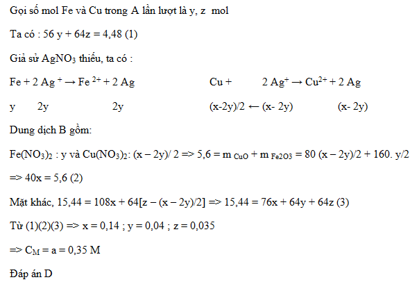 Cho 4,48 gam hỗn hợp A gồm Fe và Cu tác dụng với 400 ml dung dịch AgNO3 có nồng độ a M. Sau khỉ