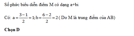 Trên mặt phẳng phức, cho điểm A biểu diễn cố phức 3-2i, điểm B biểu diễn số phức -1+6i. Mọi M là trung điểm của AB. Khi đó điểm M biểu diễn số phức nào trong các số phức sau