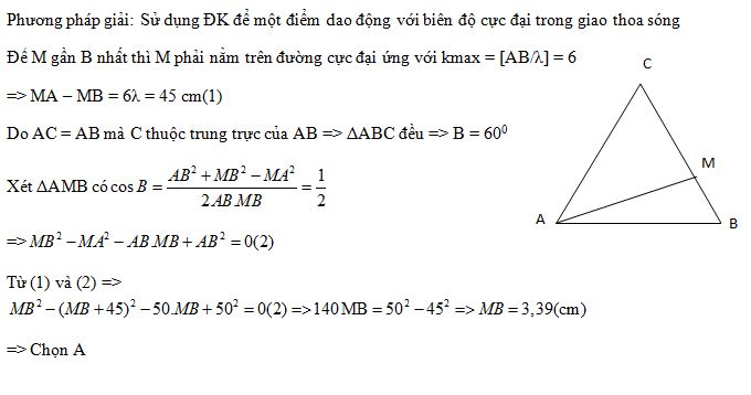 Giao thoa sóng với hai nguồn kết hợp cùng pha đặt tại AB cách nhau 50 cm với bước sóng bằng 7,5 cm. Điểm C nằm trên đường trung trực AB sao cho AC=AB. Gọi M là điểm trên đường thẳng BC và nằm trên sóng có biên độ cực đại. Khoảng cách ngắn nhất từ M đến B là.