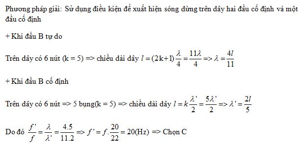 Quan sát sóng dừng trên sợi dây AB , đầu A dao động điều hòa theo phương vuông góc với sợi dây ( coi A là nút). Với đầu B tự do và tần số dao động của đầu A là 22 Hz thì trên dây có 6 nút. Nếu đầu B cố định và coi tốc độ truyền sóng của dây như cũ, để có 6 nút thì tần số dao động của đầu A phải bằng.