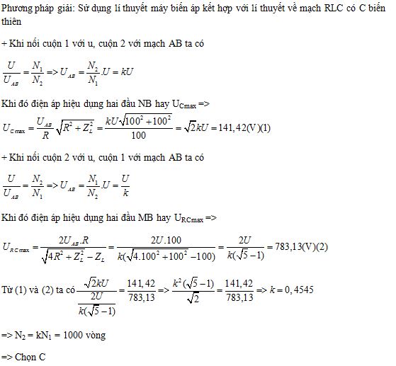 cos(100πt) (V), sau đó nối hai đầu cuộn dây (2) với đoạn mạch AB thì thấy rằng điện áp hiệu dụng đo trên đoạn NB có giá trị cực đại bằng 141,42 V. Người ta lại đổi cách mắc, cuộn (2) cũng nối với điện áp u còn cuộn (1) nói với đoạn mạch AB thì điện áp hiệu dụng đo trên đoạn mạch MB có giá trị cực đại bằng 783,13 V. Hỏi cuộn dây (2) có bao nhiêu vòng dây?