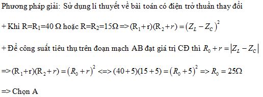 cos(100πt), trong đó U có giá trị không đổi. Khi R=R1=40 Ω hoặc R=R2=15Ω thì đoạn mạch AB tiêu thụ công suất bằng nhau. Để công suất tiêu thụ trên đoạn mạch AB đạt giá trị cực đại, phải điều chỉnh R tới giá trị bằng.