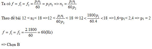 Hai máy phát điện xoay chiều một pha đang hoạt động bình thường và tạo ra hai suất điện động có cùng tần số f. Rôto của máy thứ nhất có p1 cặp cực và quay với tốc độ n1=1800 vòng /phút. Rôto của máy thứ hai có p2 =4 cặp cực và quay với tốc độ n2. Biết n2 có giá trị trong khoản từ 12 vòng/giây đến 18 vòng/giây. Giá trị của f là.