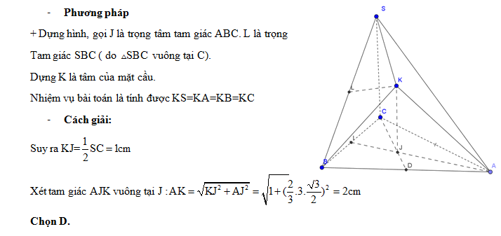 Cho hình chóp SABC có đáy là tam giác đều cạnh a=3cm, SC=2cm và SC vuông góc với đáy. Bán kính của mặt cầu ngoại tiếp hình chóp S.ABC là