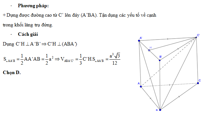 Cho lăng trụ đứng ABC.A’B’C’ có các cạnh bằng a. Thể tích khối tứ diện ABA’C’ là: