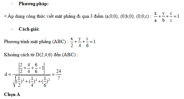 Trong không gian với hệ tọa độ Oxyz, cho A(2;0;0); B(0;4;0); C(0;0;6) và D(2;4;6). Khoảng cách từ D đến mặt phẳng (ABC) là