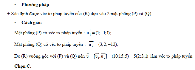 Cho hai mặt phẳng (P): x-y+z-7=0, (Q): 3x+2y-12z+5=0. Phương trình mặt phẳng (R) đi qua gốc tọa độ O và vuông góc với hai mặt phẳng nói trên là