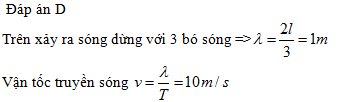 Trong thí nghiệm về sóng dừng, trên một sợi dây đàn hồi dài 1,5m với hai đầu cố định, người ta quan sát thấy ngoài hai đầu dây cố định còn có hai điểm khác trên dây không dao động. Biết khoảng thời gian giữa hai lần liên tiếp với sợi dây duỗi thẳng là 0,05 s. Vận tốc truyền sóng trên dây là
