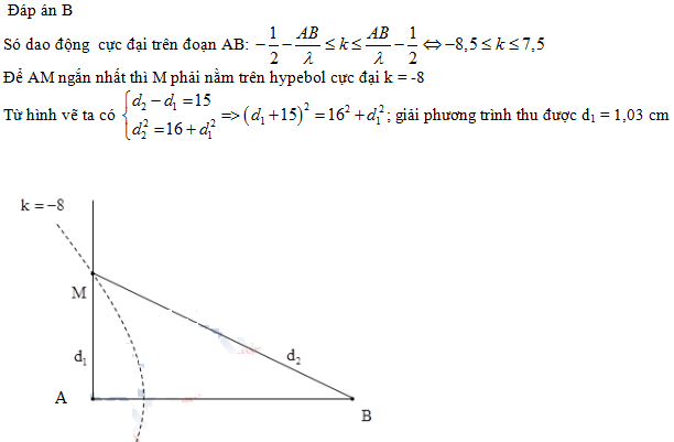 Tại mặt chất lỏng có hai nguồn phát sóng kết hợp A, B cách nhau 16cm, dao động điều hòa theo phương vuông góc với mặt chất lỏng với phương trình uA = 2cos40πt cm và uB = 2cos(40πt + π) cm. Tốc độ truyền sóng trên mặt chất lỏng là 40cm/s. Gọi M là một điểm thuộc mặt chất lỏng, nằm trên đường thẳng Ax vuông góc với AB, cách A một đoạn ngắn nhất mà phần tử chất lỏng tại M dao động với biên độ cực đại. Khoảng cách AM ngắn nhất bằng