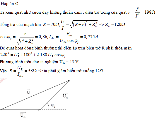 Trong một giờ thực hành một học sinh muốn một quạt điện loại 180 V - 120W hoạt động bình thường dưới điện áp xoay chiều có giá trị hiệu dụng 220 V, nên mắc nối tiếp với quạt một biến trở. Ban đầu học sinh đó để biến trở có giá trị 70 Ω thì đo thấy cường độ dòng điện hiệu dụng trong mạch là 0,75A và công suất của quạt điện đạt 92,8%. Muốn quạt hoạt động bình thường thì phải điều chỉnh biến trở như thế nào?