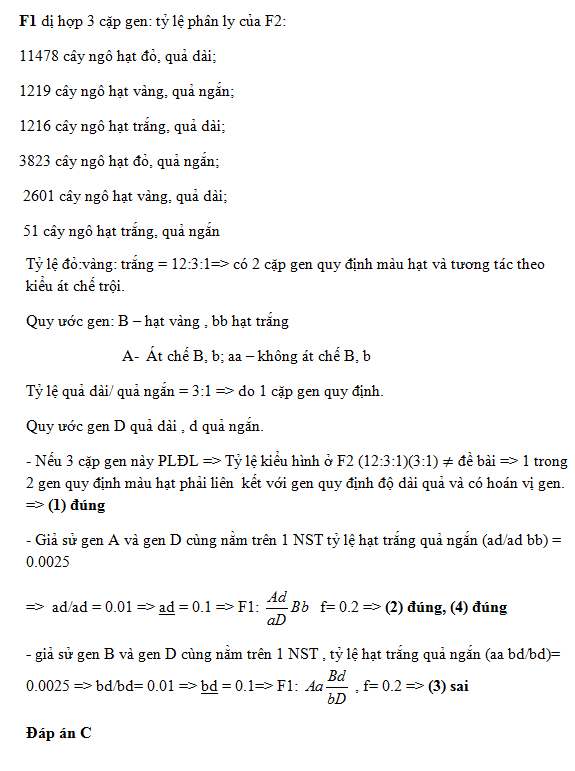 Đem tự thụ phấn giữa F1 dị hợp ba cặp gen, kiểu hình ngô hạt đỏ, quả dài với nhau, thu được kết quả F2 như sau: 11478 cây ngô hạt đỏ, quả dài; 1219 cây ngô hạt vàng, quả ngắn; 1216 cây ngô hạt trắng, quả dài; 3823 cây ngô hạt đỏ, quả ngắn; 2601 cây ngô hạt vàng, quả dài; 51 cây ngô hạt trắng, quả ngắn. A-B-, A-bb: hạt đỏ; aaB-: hạt vàng; aabb: hạt trắng. D: quả dài; d: quả ngắn