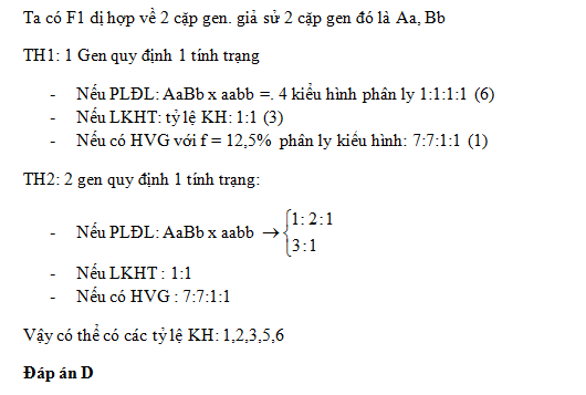 Ở một loài thực vật, xét 2 gen nằm trong nhân tế bào, mỗi gen đều có 2 alen. Cho hai cây (P) thuần chủng khác nhau về cả hai cặp gen giao phấn với nhau, thu được F1. Cho F1 lai với cơ thể đồng hợp tử lặn về cả hai cặp gen, thu được Fa. Biết rằng không xảy ra đột biến và nếu có hoán vị gen thì tần số hoán vị là 12,5%, sự biểu hiện của gen không phụ thuộc vào điều kiện môi trường. Theo lí thuyết, trong các trường hợp về tỉ lệ kiểu hình sau đây, có tối đa bao nhiêu trường hợp phù hợp với tỉ lệ kiểu hình của Fa?