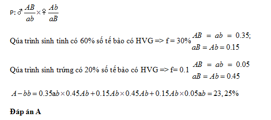 Ở một loài thực vật, A quy định quả ngọt là trội hoàn toàn so với a quy định quả chua; alen B quy định chín sớm là trội hoàn toàn so với b quy định chín muộn. Hai cặp gen quy định tính trạng liên kết không hoàn toàn trên cặp NST thường. Cho P: Biết rằng có 60% số tế bào sinh tinh và 20% số tế bào sinh trứng gia giảm phân có xảy ra hoán vị gen, không xảy ra đột biến. Theo lý thuyết thì kiểu hình quả ngọt, chín muộn ở F1 chiếm tỉ lệ: