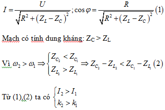thì cường độ dòng điện hiệu dụng và hệ số công suất của đoạn mạch lần lượt là I1 ,k1 và I2, k2. Khi đó ta có