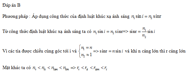 Cho một tia sáng tạp sắc cấu tạo bởi bốn thành phần đơn sắc: vàng, lam, lục và tím truyền nghiêng góc với mặt phân cách từ nước ra không khí. Sắp xếp theo thứ tự góc khúc xạ tăng dần của các tia sáng đơn sắc. Thứ tự đúng là