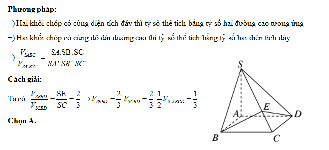 Cho hình chóp S.ABCD có đáy ABCD là hình bình hành và có thể tích bằng 1. Trên cạnh SC lấy điểm E sao cho SE = 2EC. Tính thể tích V của khối tứ diện SEBD